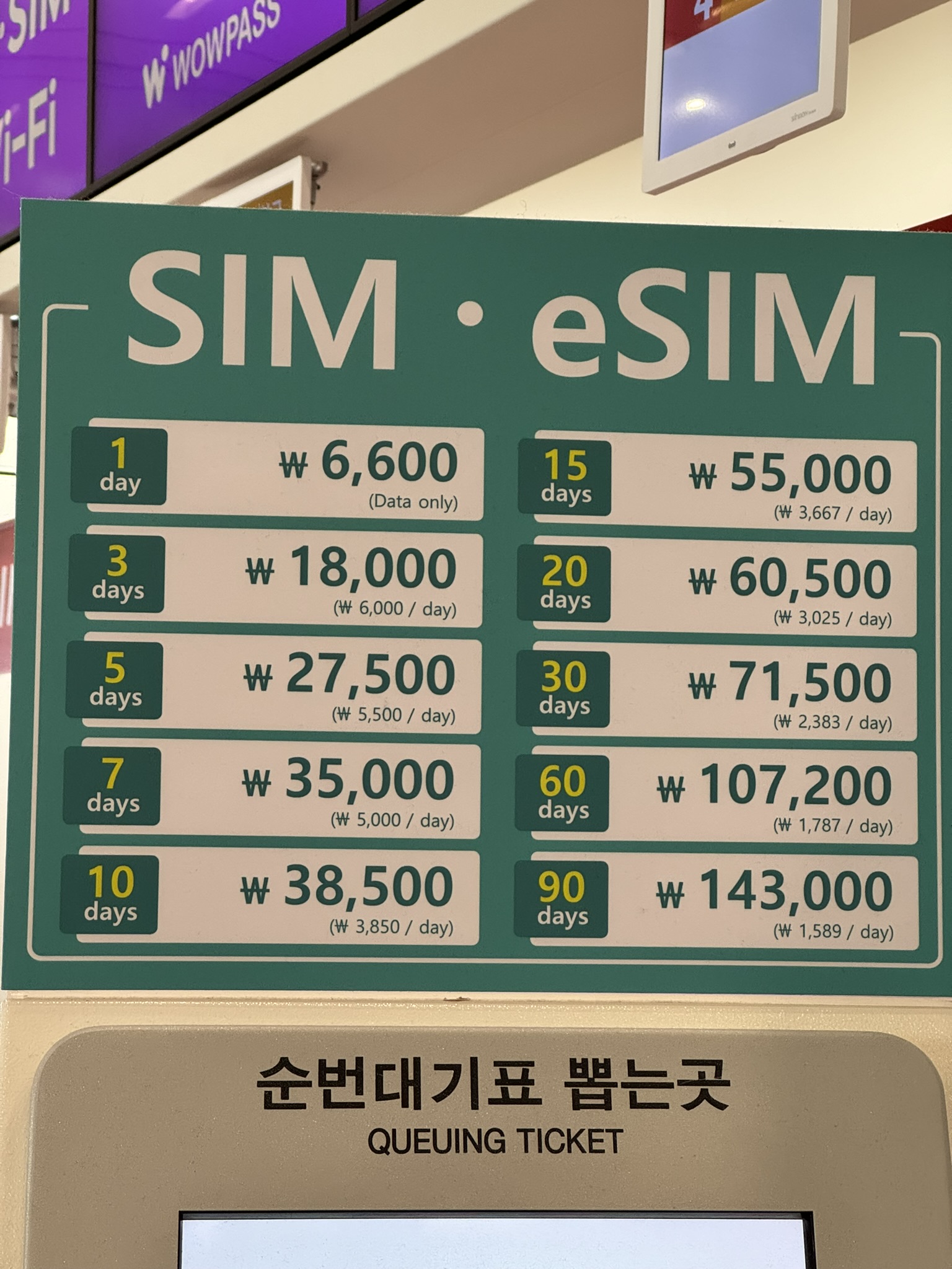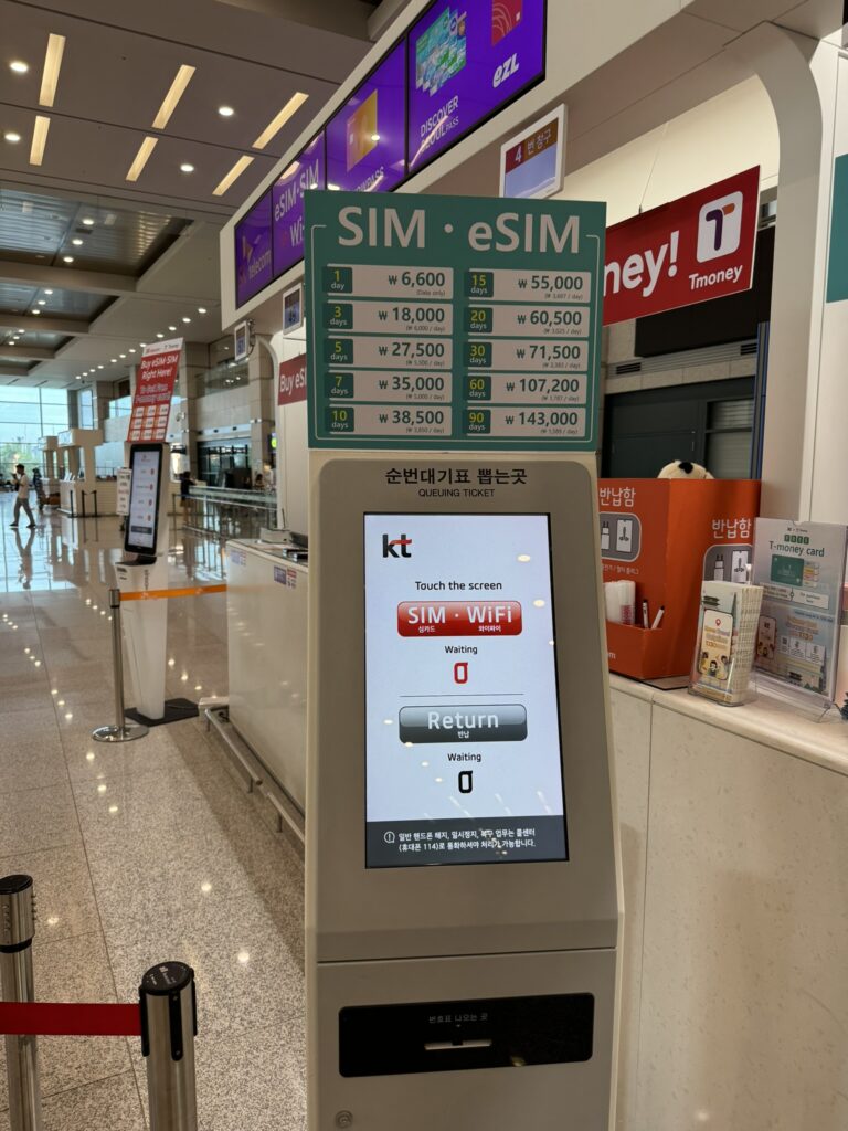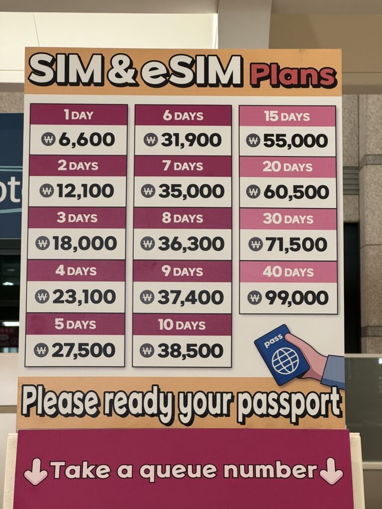 Am Flughafen können sie gleich am Flughaben ein Simkarte mit einer Koreanischen Rufnummer und Daten kaufen. Die Preise sind wie folgt: